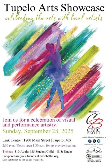 Dialog is the foundation of human appreciation and growth. To extend the influence and support of Civic Ballet into all the Fine Arts and artists of Tupelo and the region, the Tupelo Arts Showcase provides opportunity for the interaction of the community with the artists. Tupelo Arts Showcase, or TAS, provides a less formal encounter to facilitate conversation and introductions to the many fine artists of our community.